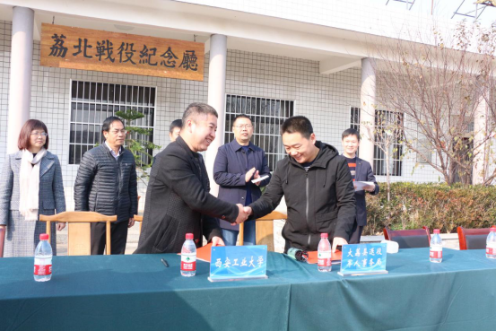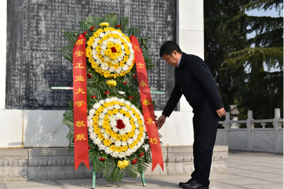 西安工业大学与荔北战役烈士陵园共建实践教育基地、思想政治理论课实践教学基地揭牌仪式于11�21日在荔北战役烈士陵园举行。校党委副书记吴介军、马克思主义学院院长田亮、校团委书记王守民、计算机学院党委副书记李明芳、马克思主义学院院长助理孟文科;大荔县退役军人事务局副局长杨斌、大荔县烈士陵园管理中心主任高卫光、大荔县退役军人事务局安置股股长赵冲,�40名学生党员参加了揭牌仪式。仪式由孟文科主持�