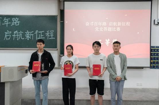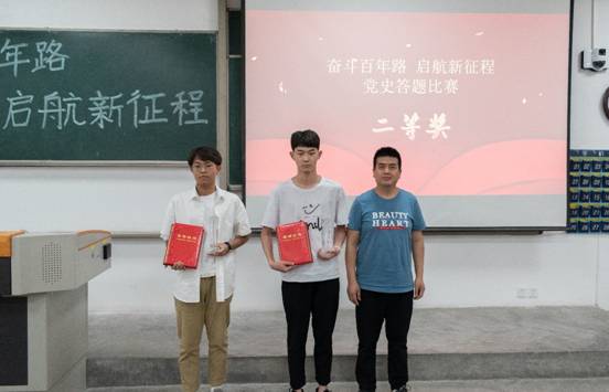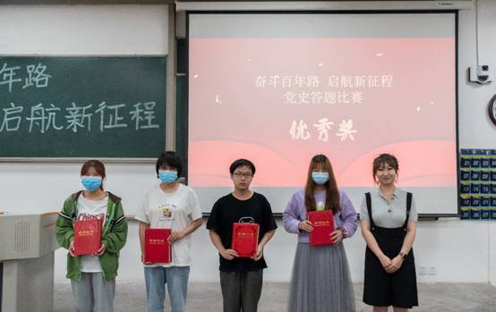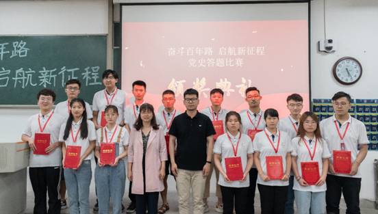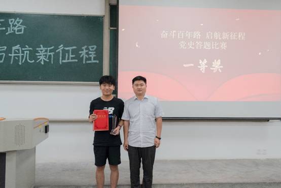 随后,计算机学院辅导员李凯、解军强、于杰及学生处处长助理何鹏程四位老师分别为荣获本次比赛的优秀奖、三等奖、二等奖及一等学生奖颁发奖杯及证书。计算机学院党委副书记李明芳、团委书记孙君两位老师为“e起学党史”团队成员颁奖并合影留念�