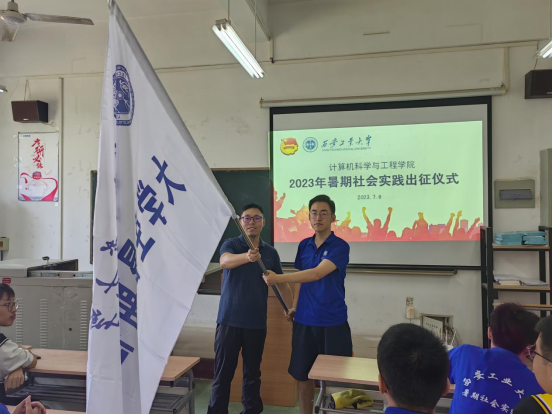 2023年暑期社会实践团队授旗,并对暑期社会实践中前期准备工作、实践开展方法、后期材料提交要求、宣传报道技巧及安全注意事项等作了详细说明。实践团队成员代表刘秦伟作了表态发言。