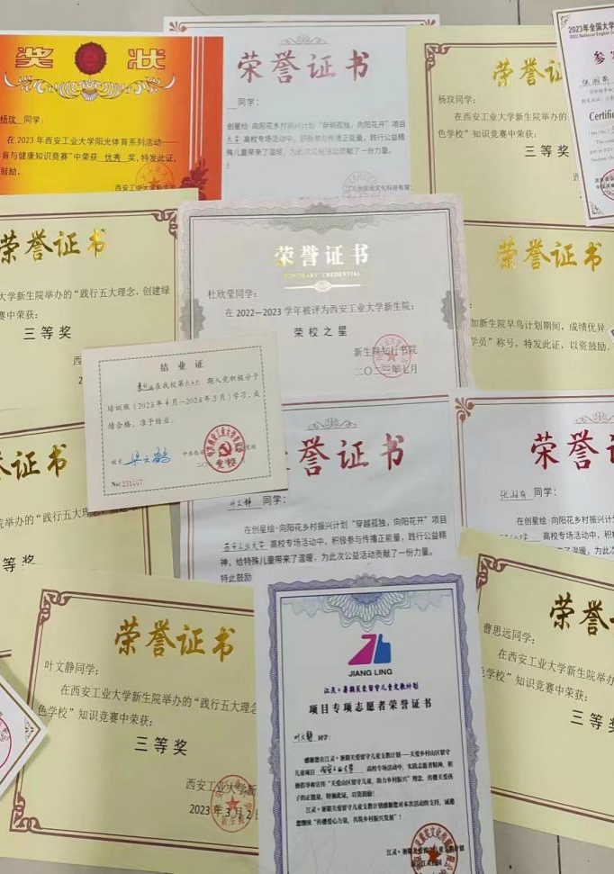 杜欣莹:荣获三等学业奖学金、西安工业大学春季运动会女子2分钟集体跳绳冠军、荣获新生院“荣校之星”