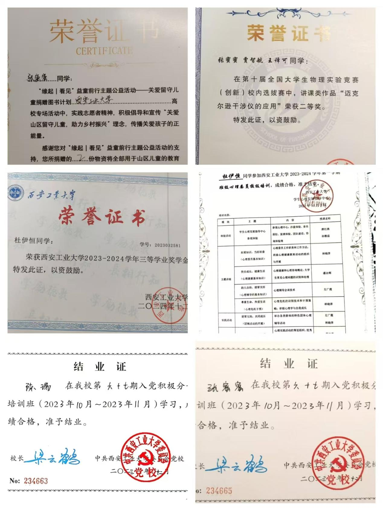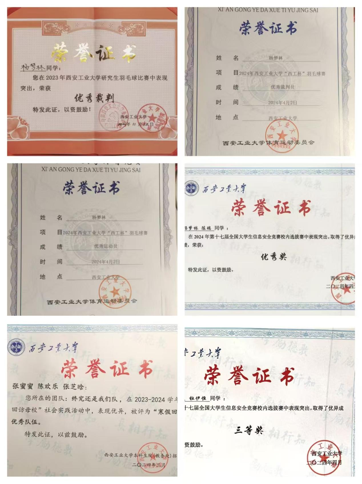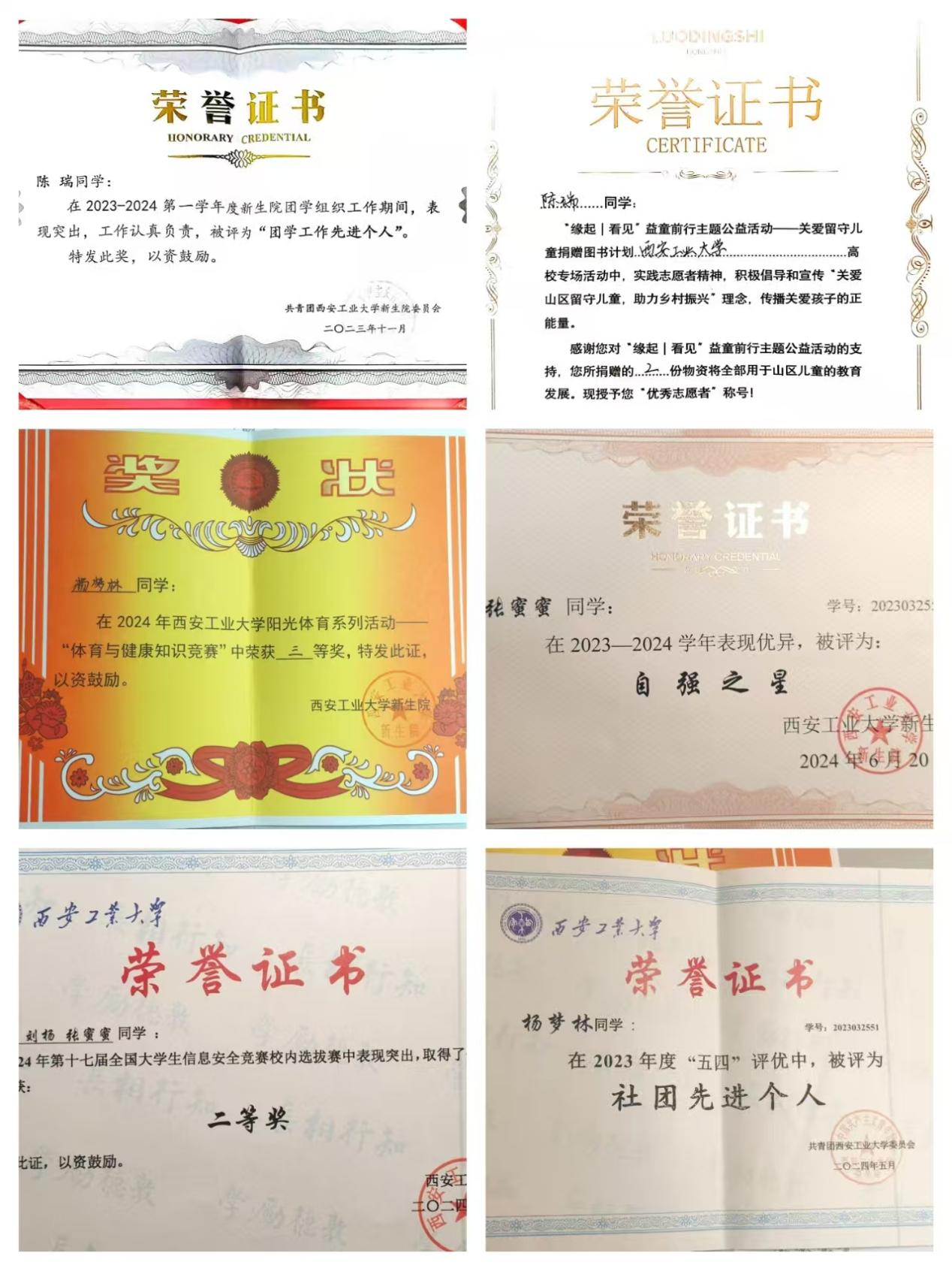 思想政治上,寝室成员积极向党组织靠拢,入党申请书递交率100%。一人参加了第3期青马班并顺利结业,4人参加了入党积极分子培训班并顺利结业,团日出勤率100%,青年大学习完成率100%。学习上,寝室成员学习氛围和谐,成绩良好,无挂科和重修现象,无任何违纪行为,平均绩点3.43。专业前十占比4人,专业前五占比2人。第二课堂平均分17.64分。课外实践上,宿会成员社会实践率100%,在2023-2024学年“寒假回访母校”社会实践中,被评为优秀队伍。寝室成员积极参与学校志愿活动,如迎新志愿、国际文化节志愿等。工作上,寝室五人担任班级干部及院学生会、社团等核心职位,在各个领域发光发热,受到师生一致好评。寝室建设上,15-209三次上榜“宿舍文明,室雅人和“星级文明寝室名单,三次荣获流动红旗,两次在XATU新生代公众号展示,在2023-2024年度被评为“优秀宿舍“。
