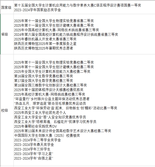 西工啄木鸟团队主席、陕历博志愿队校队副队长、书法协会副主席及计科院新媒体推送部干事等职务,她始终以“勤学、修德、明辨、笃实”为准则,在学习、竞赛、实践与工作的浪潮中不断探索,努力书写属于自己的成长篇章。