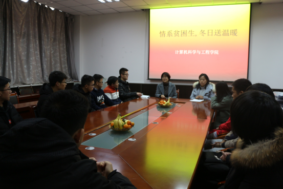 积极响应学校的号召,12月18日,在工1-306开展了“情系贫困生,冬日送温暖”活动。院党委副书记李明芳、辅导员吴宗原、冯倩、董元浩以及16级、17级、18级共20名贫困生代表参加了活动,会议由冯倩主持。