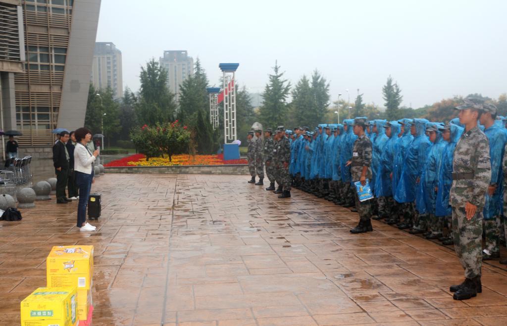 党委副书记李明芳一行看望慰问了冒雨坚持训练的教官及学生,辅导员组长杨小斐老师主持慰问活动。