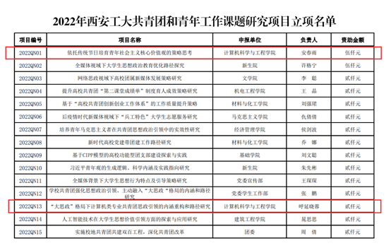 安春雨老师申报的《依托传统节日培育青年社会主义核心价值观的策略思考》获批重点课题立项,呼延晓蓉老师申报的《“大思政”格局下计算机类专业共青团思政引领的内涵重构和路径研究》获批一般课题立项,在学校首次开展的共青团和青年工作课题研究项目申报工作中取得了良好成绩。