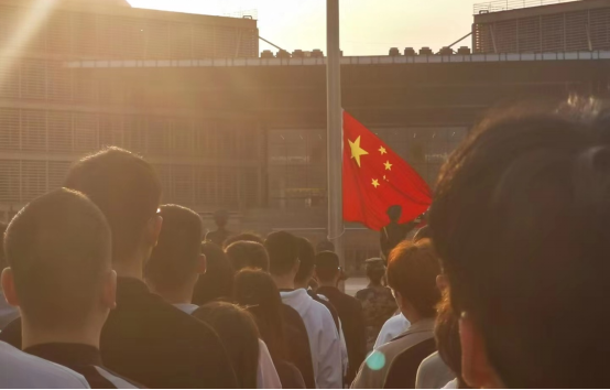 随后国护负责人宣布:“奏国歌,升国旗,向国旗行注目礼!”伴随着激昂的《义勇军进行曲》响起,五星红旗冉冉升起,迎风飘扬,全体师生肃然起敬,向国旗行庄严注目礼,自豪与骄傲之情油然而生。