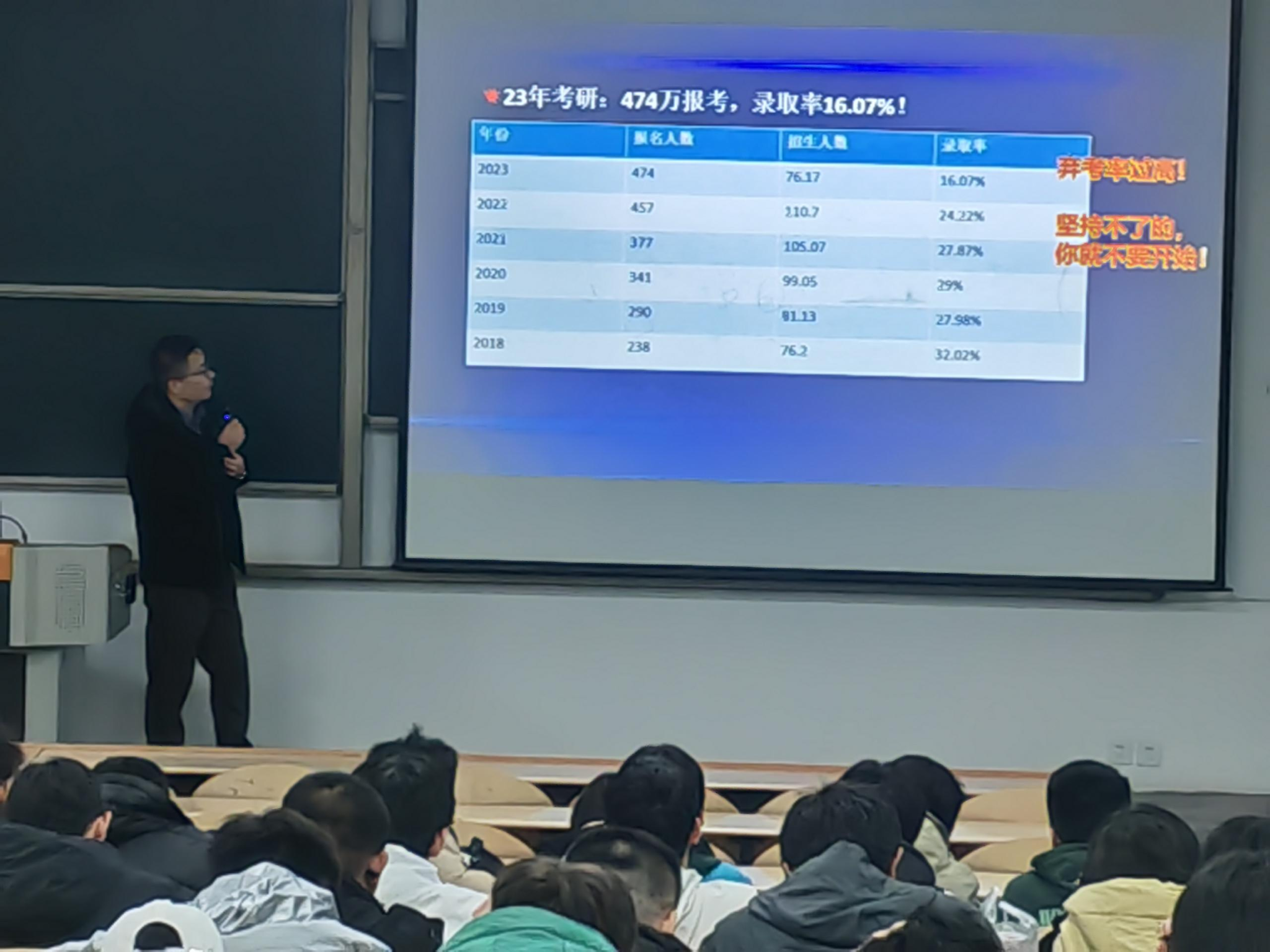首先,苏老师围绕考研形势、考研常识、考研准备、考研核心、就业选择以及如何规划六个方面,为同学们指出毕业选择路径,讲解考研基本流程,传授备考技巧,分析考研难易以及考研成功与否的关键问题。