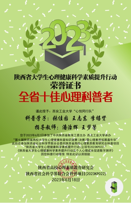 张佳园同学参与组成的“心悦同行”代表队在决赛中荣获二等奖并获得“全省十佳心理科普者”称号,辅导员王梦馨作为指导教师获奖。