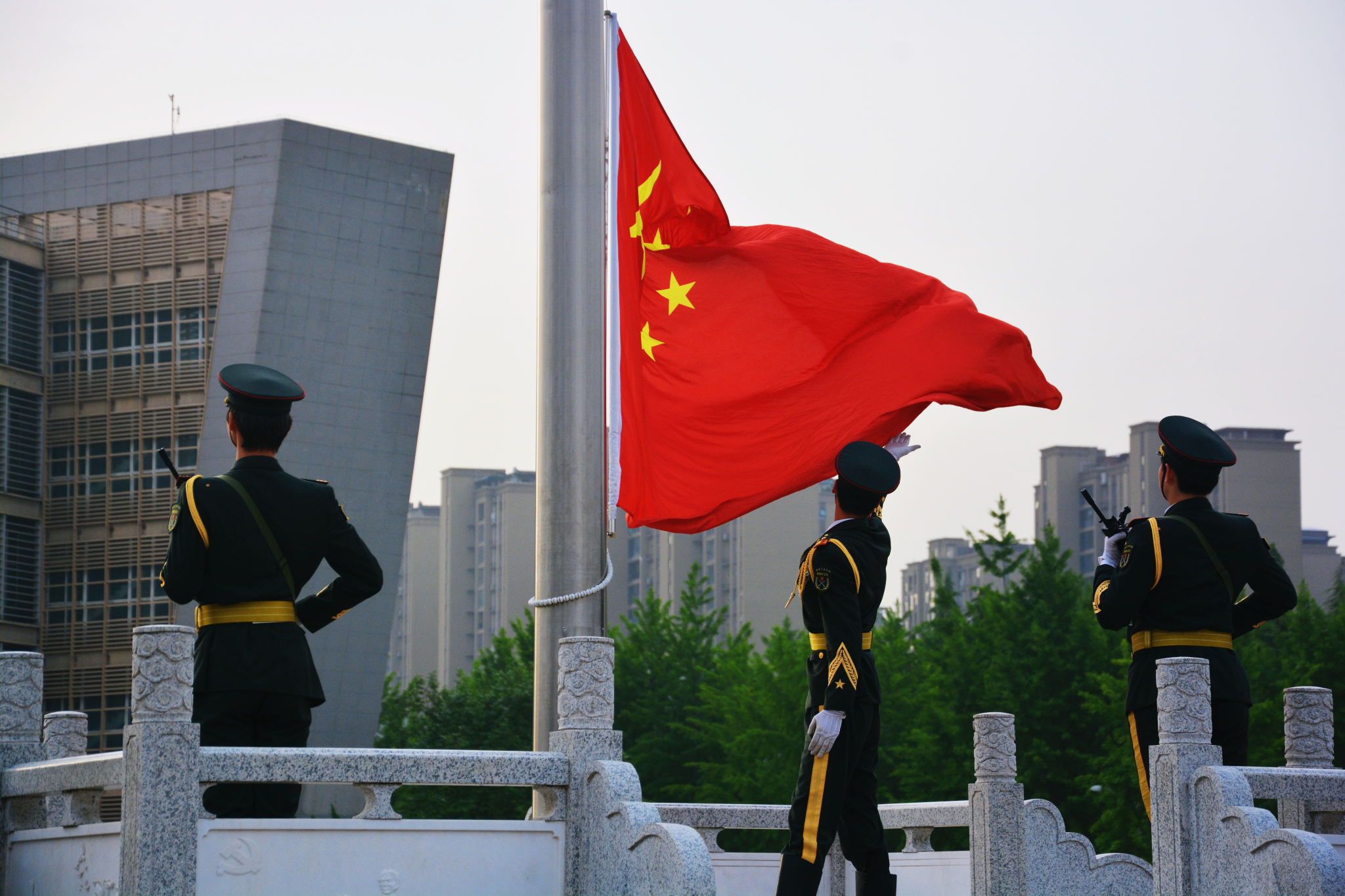 晨光熹微,天色渐明,迎着朝阳,全体师生庄严肃立。升旗仪式正式开始,国旗护卫队的护旗方阵迈着铿锵有力的步伐护送鲜艳的五星红旗进场。伴随着激昂雄壮的国歌,五星红旗迎风飘扬,冉冉升起。全体师生满怀敬意,胸怀对祖国的热爱,共同高唱国歌。