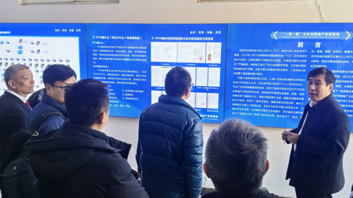 汇报会议之前,柏司长一行及西安工业大学副校长陈建参观一带一路与未来网络产学研基地,基地负责人王中生全程讲解IPV9重大技术及应用现状。
