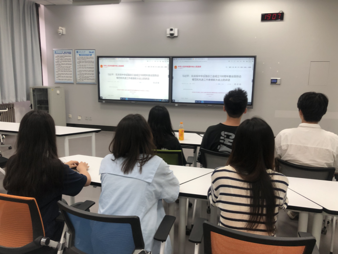 少数民族学生在教3-103学习了习近平总书记在庆祝中华全国总工会成立100周年暨全国劳动模范和先进工作者表彰大会上的重要讲话。