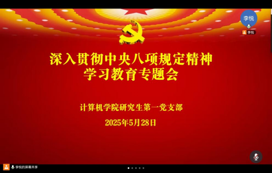 2025年5月28日,研究生第一党支部组织了党员开展“践行党的八项规定 学生党员该如是做”主题学习交流,活动由党委副书记李悦同学主持。