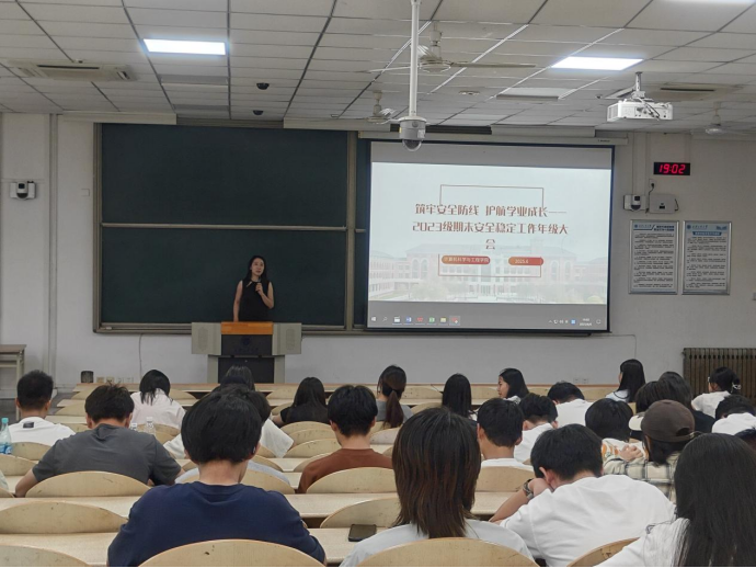 2023级在教1-101召开年级大会。2023级辅导员呼延晓蓉、李凯、于杰及全体学生参加会议,围绕安全教育、日常管理、风险排查等重点工作进行部署。