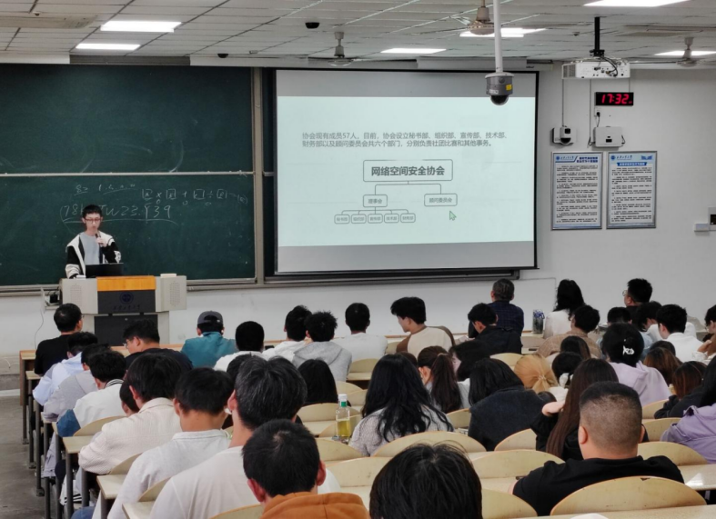 讲座由王亚文老师主持,季靖围绕网络安全的基本概念、法律法规、防护措施及从业者成长路径四个方面展开。他与现场同学们积极互动,以诗句“七八个星天外,两三点雨山前”为例,现场演示生成高强口令“78GXTW 23.Y3Q”,强调“安全始于细节”。在职业发展部分,他提出“兴趣驱动、目标拆解、靶场实践、社区追踪”四步成长路径,鼓励同学们多动手、多反思、多分享,并指出“把握机遇与风口同样重要”。随后,我校网络空间安全协会负责人李佳阳简要介绍了网安协会的发展历程与本学期的招新计划,激发了不少新生同学的兴趣和热情,积极踊跃扫码入群。