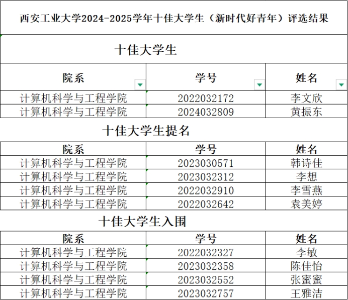 11月11日,在西安工业大学2024-2025学年“十佳大学生”校赛评选中,我院22级数据科学与大数据技术专业李文欣同学、24级软工程专业黄振东同学凭借卓越的综合素养、扎实的专业功底和昂扬的精神风貌,在激烈的校级角逐中脱颖而出,斩获“十佳大学生”荣誉称号。韩诗佳、李想、李雪燕、袁美婷四位同学获得“十佳大学生提名奖”;李敏、陈佳怡、张蜜蜜、王雅洁四位同学获得“十佳大学生入围奖”。获奖等级与数量均位居学校前列。