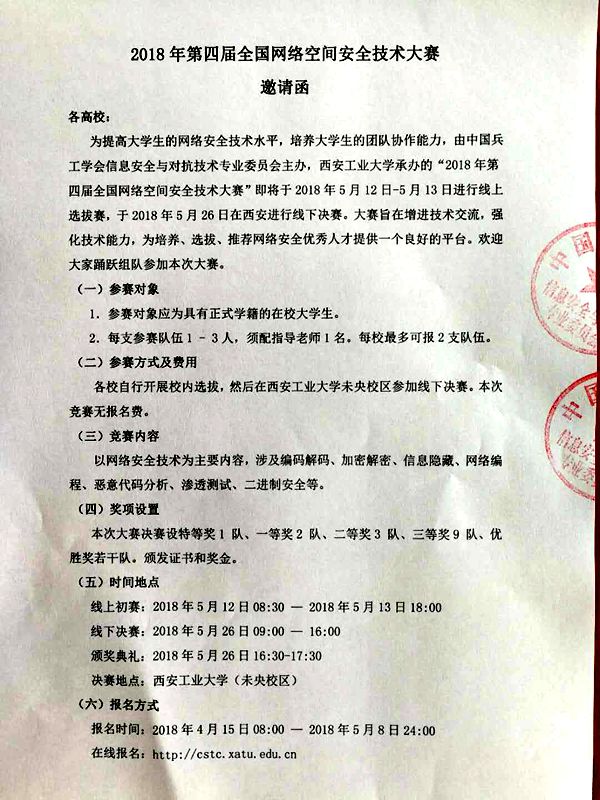 为提高大学生的网络安全技术水平,培养大学生的团队协作能力,由中国兵工学会信息安全与对抗技术专业委员会主办,西安工业大学承办的“2018年第四届全国网络空间安全技术大赛”即将于2018年5月12日-5月13日进行线上选拔赛,于2018年5月26日在西安进行线下决赛。大赛旨在增进技术交流,强化技术能力,为培养、选拔、推荐网络安全优秀人才提供一个良好的平台。欢迎大家踊跃组队参加本次大赛。