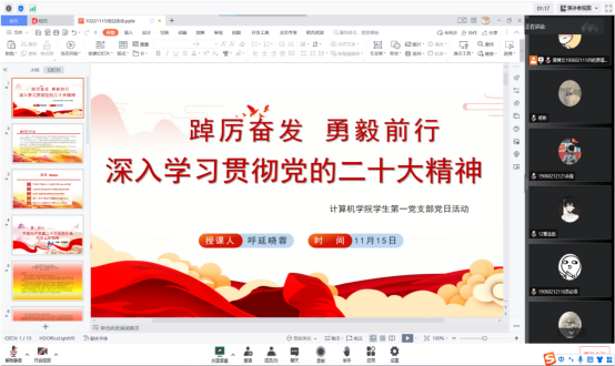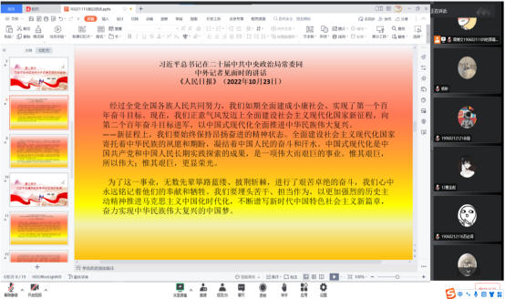 学生第一党支部在11月15日下午19:00开展主题为“踔厉奋发、勇毅前行,深入学习贯彻党的二十大精神”的党日活动。考虑到当前疫情防控形势,本次党日活动采用线上会议的方式进行。参会人员有党支部书记呼延晓蓉,正式党员和发展对象。会议由党支部副书记王佳钰同志主持,首先对会议议程进行简述,明确会议学习内容。