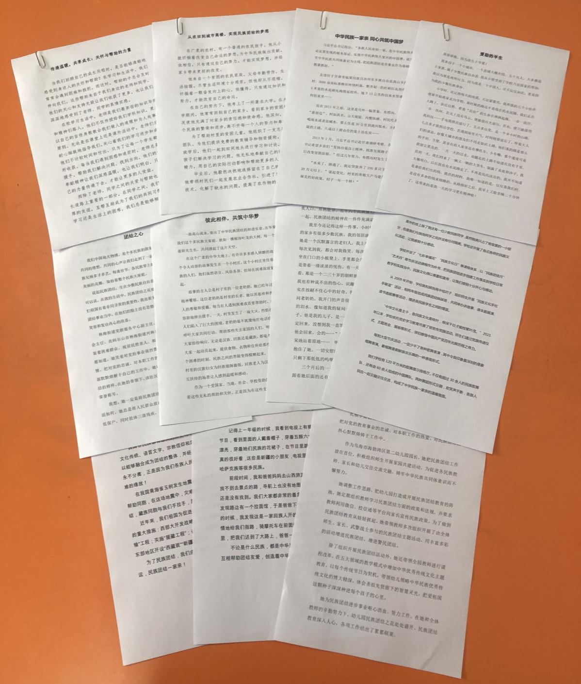 活动共收到征文十多篇,内容涵盖少数民族地区在国家政策扶持下发生的变化;脱贫攻坚行动在少数民族地区取得的成效;少数民族学生学成返乡投身志愿服务;少数民族学生学习生活中老师同学的关心帮助;爱心人士对少数民族孤寡老人的照顾;灾害发生后不同民族群众间的守望相助;社区干部对少数民族困难群众用心用情的关怀;少数民族地区学校开展的形式多样的民族团结教育活动;少数民族困难学生在各方资助下成长成才这些方面。