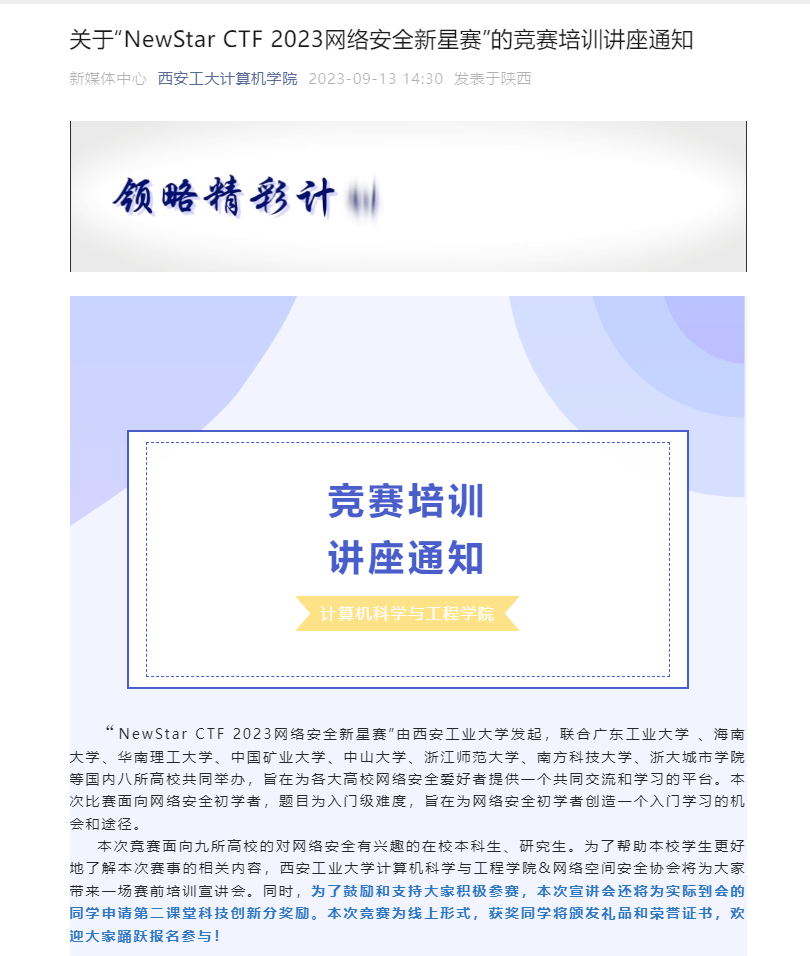 等国内八所高校共同参与的“NewStarCTF 2023网络安全新星赛”赛前培训宣讲会。旨在为网络安全初学者创造一个入门学习的机会和途径,更是为各大高校网络安全爱好者提供一个共同交流和学习的平台。