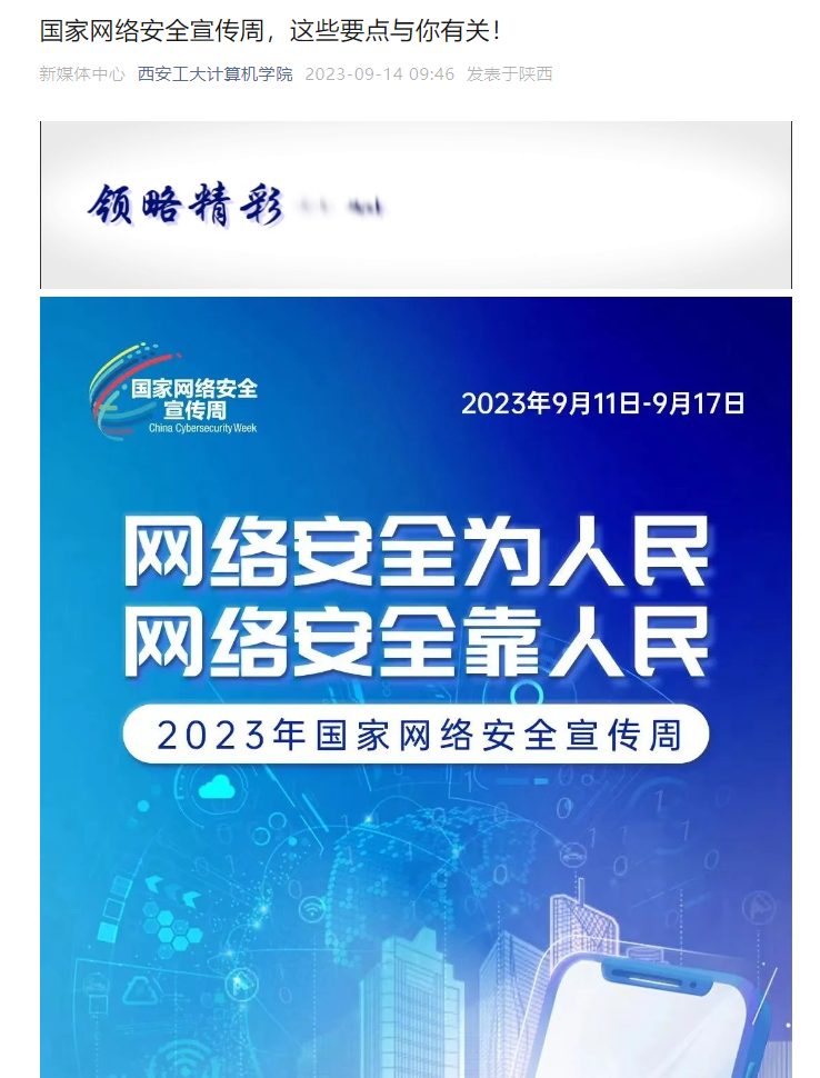 LED大屏、网络橱窗、微信公众号、视频号等形式,以正确的网络安全观、个人增强安全意识、提高个人安全知识水平、文明上网等内容,在全校范围内进行网络安全周活动宣传报道。
