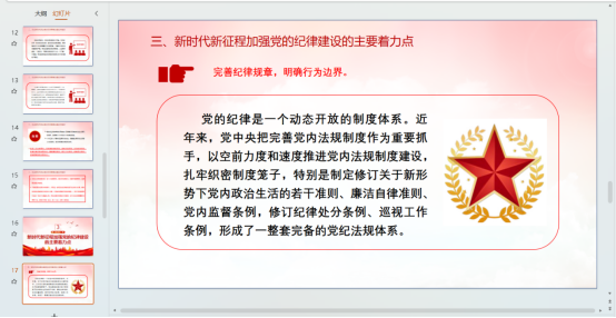 本次党课由呼延晓蓉同志主讲,围绕“加强纪律建设是无产阶级政党的本质属性”“完成新时代党的使命任务需要加强党纪建设”“新时代新征程加强的纪律建设的主要着力点”三个方面展开讲解,阐释了开展党纪学习教育的重要意义和要求。