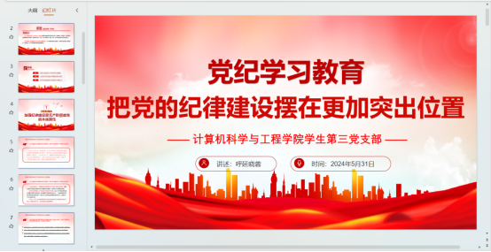 通过图文的方式,呼延晓蓉同志特别介绍了关于《条例》的修订与学习的通知要求,要让支部党员认识到党纪学习教育不仅要坚持逐章逐条学,还要联系实际学,主动深入学,注重融入日常、学用结合。结合《条例》的细读,支部书记呼延晓蓉同志强调:须在学习贯彻《条例》上下功夫见成效,抓住学习重点;严格遵守党章党纪,切实把思想和行动统一到党章上来;增强学生党员的身份意识和深刻认识到党纪学习教育的重要性,把党的纪律印在心上,严格遵守。强化自我约束,规范自身言行举止,在日常学习生活中发挥先锋模范作用,密切联系群众,辐射带动身边同学,自觉维护党和国家形象、维护党的团结统一。