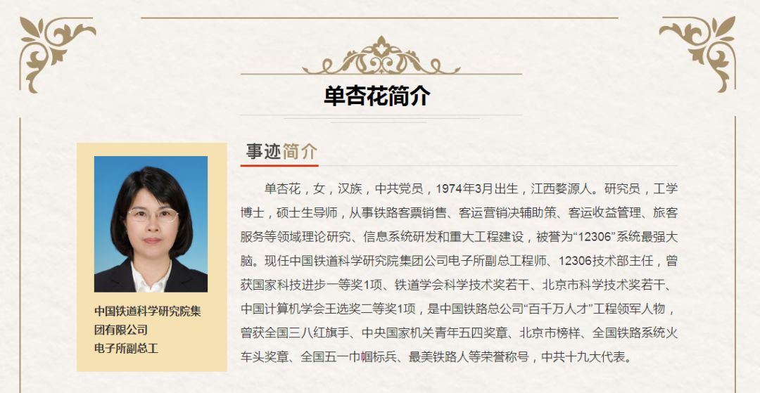 单杏花,女,汉族,中共党员,1974年3月生,江西婺源人,中国铁道科学研究院集团有限公司电子所副总工,从事铁路客票销售、客运营销决策辅助、客运收益管理、旅客服务等领域理论研究、信息系统研发和重大工程建设,被誉为“12306”系统最强大脑。中国铁路总公司“百千万人才”工程领军人物,获国家科技进步奖一等奖、中国计算机学会王选奖二等奖。党的十九大代表,荣获全国三八红旗手、全国五一巾帼标兵、最美铁路人等荣誉称号。