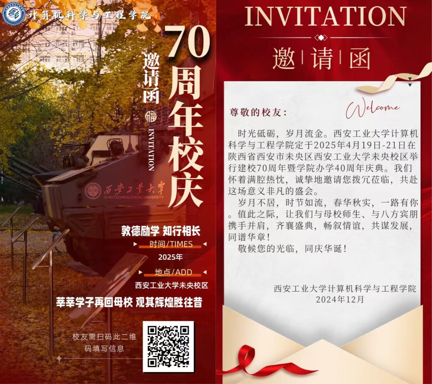 时光砥砺,岁月流金。在岁月的长河中,西安工业大学已走过了70年的光辉历程。今天,我们怀着无比激动与喜悦的心情,诚挚地邀请您重返母校,共庆这一意义非凡的校庆盛典。